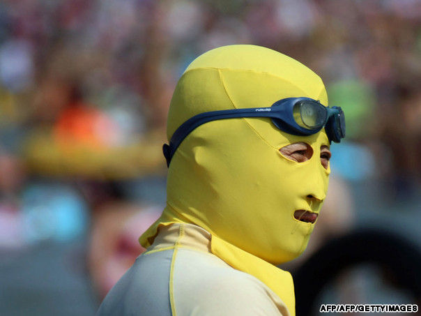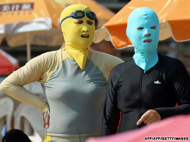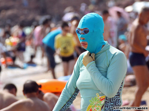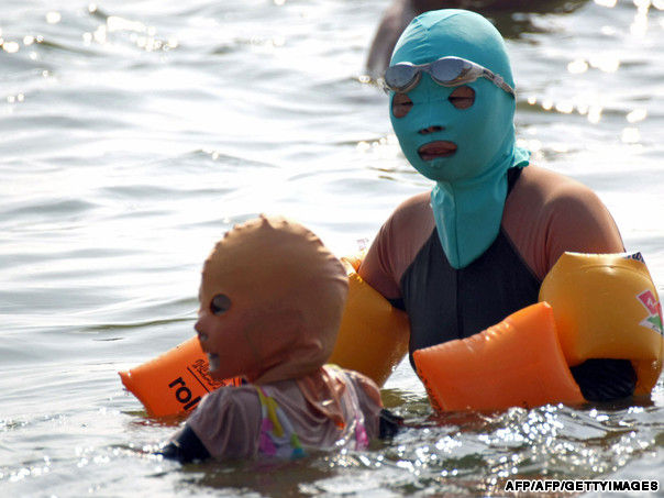 【7月5日 AFP】中国・山東省(Shandong)の青島(Qingdao)のビーチで3日、水着のほかに覆面マスクも一緒に着用する海水浴客たちの姿が見られた。この海水浴向けの覆面マスクは、中国のネットユーザーから「フェイスキニ(Face-kini)」と呼ばれている。本来の目的は、顔と顔周辺の日焼け防止だが、虫やクラゲ対策にも効果的だという。(c)AFP