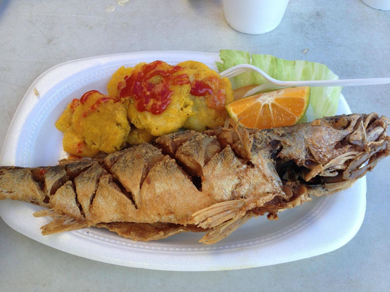オレンジの横にあるチキンナゲットみたいなやつがバナナ揚げ?