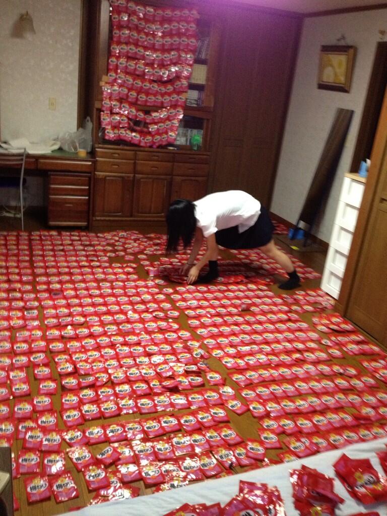 引用元: 【衝撃画像】 女子高生の妹が7年間ためた梅ねりの袋を並べてる。ギネスを目指してるらしい。